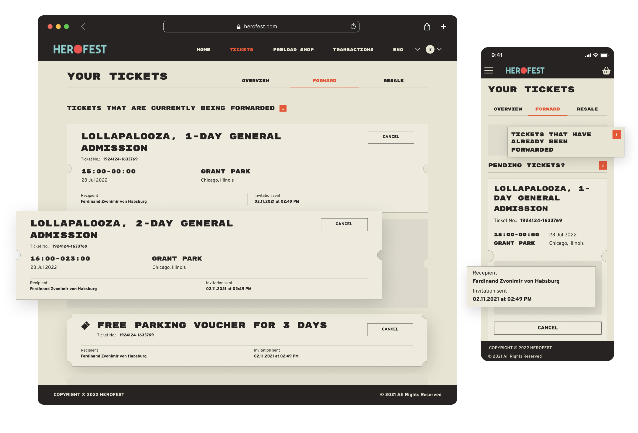 After changing the marketplace architecture, there was a need to customize the panel in such a way that all settings of the festival would automatically display on the visitor's page. So, numerous settings and functions allow you to organize an event entirely according to the tasks of the event maker. As a result, the user can get a ticket of different access levels in the personal account, sell or change a card, and top up the balance in real time with its instant upload to the bracelet. The visitor can view the history of transactions and purchases, and receive additional bonuses from the organizers during the event. The organizer can upload event reports using custom filters and parameters, considering the information from all visitors tickets.